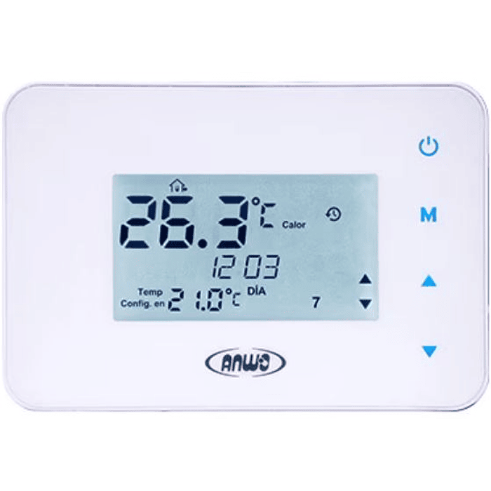 El Termostato programable “ANWO Wi-Fi” está diseñado para controlar un sistema de calefacción central, comercial o residencial, con un elegante y moderno diseño. El termostato ANWO Wi-Fi es capaz de controlar la temperatura ambiente de manera eficiente mediante una serie de parámetros configurables que permiten el correcto control de los recintos calefaccionados. El termostato es de fácil programación usando la aplicación “TERMOSTATO ANWO WIFI” para dispositivos móviles (iOS/Android).